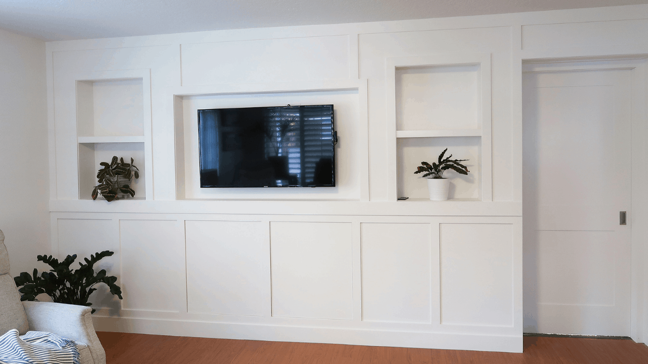 The design was done in such a way so the TV can hang right in the middle of the wall and all of the wall details will be symmetrical and even.